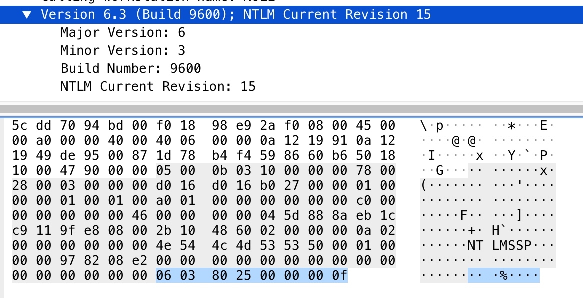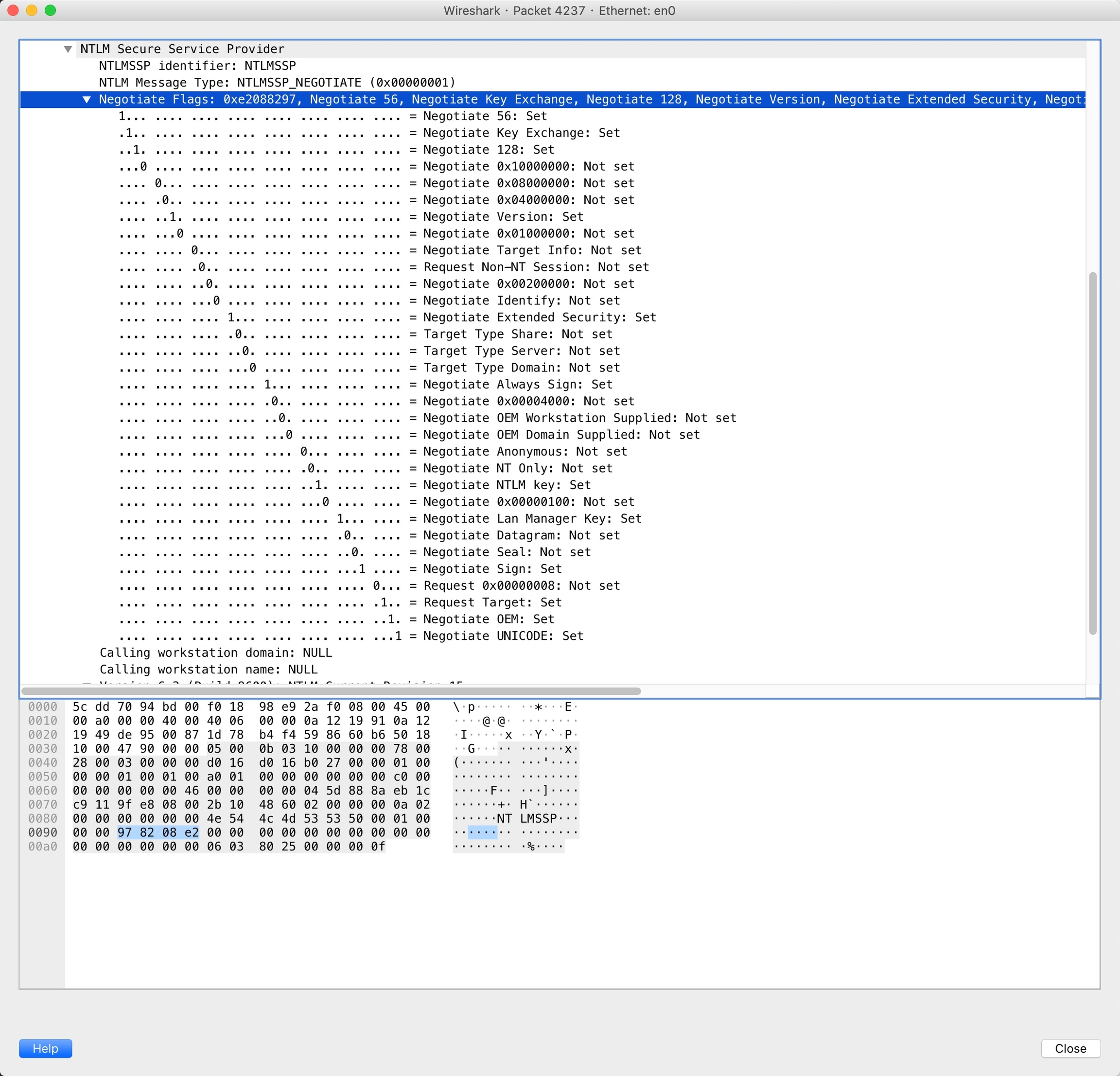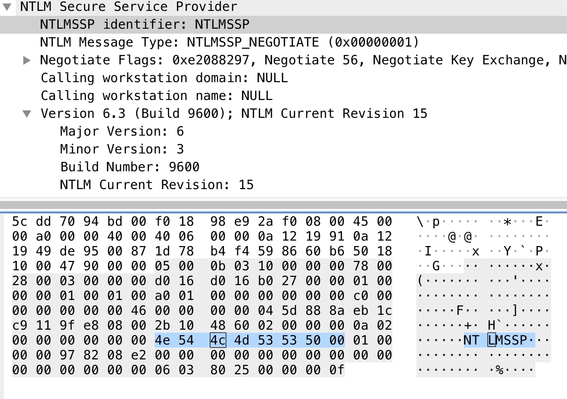 所有消息均以NTLMSSP签名开头,该签名(适当地)是以null终止的ASCII字符串" NTLMSSP"(十六进制的" 0x4e544c4d53535000 ")。